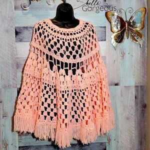 Handmade Knitted Crochet Soft Pink Poncho Cape One Size BoHo Retro