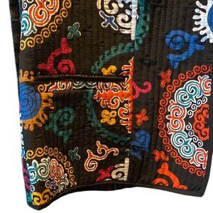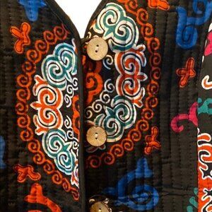 This handmade vest showcases intricate ethnic swirl patterns in vibrant colors, crafted from quilted material for added texture and warmth. It features wooden button closures and side pockets, offering both style and functionality. A unique addition to any wardrobe, emphasizing craftsmanship and cultural artistry. Multicolor Bohemian vest. Size xl