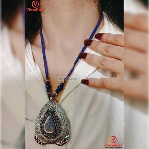 This handcrafted semi-precious Lapis Lazuli stone pendant necklace is a striking piece of boho-chic jewelry designed to make a grand statement. The necklace features chunky semi-precious Lapis Lazuli stones complemented by elegant blue and red beads, creating a double-layer design that exudes charm and sophistication.