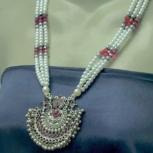 Introducing our exquisite multilayer beaded tribal necklace with a stunning filigree archaic pendant, handcrafted by our skilled artisans from South Asia. This vintage-inspired necklace features three white pearls and multi-hued beaded layers that connect in the middle with a beautiful antique pendant.