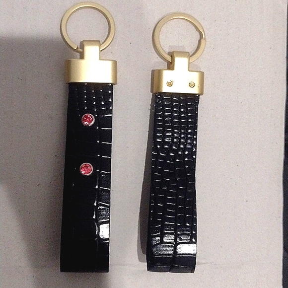 Handmade, shiny genuine leather keyfobs. Great Christmas gift for him or her. Crocodile embossed with decorative colored crystal rivets and strong golden hardware. Crystals available in Pink, Clear and. Red.