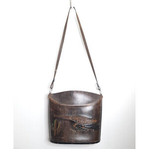 Handmade leather carry bag is made with Premium genuine leather with attention to details. Adjustable leather shoulder strap and top handle allow you to easily carry this bag however you like. Handcrafted details include a beautiful leather top attached to the carry strap, with a "bird" design on the front.