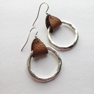 Hammered Silver alloy hoop that has a real Brown leather strap connecting to a Silver plated nickel free ear wire.
