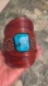 This is a wrist cuff made out of thick leather. It has a decorative stone in front, but I don’t believe that it is a real gemstone. Theres silver and copper detail. It’s blue on the inside and has two buckles. Very sturdy and will last forever.