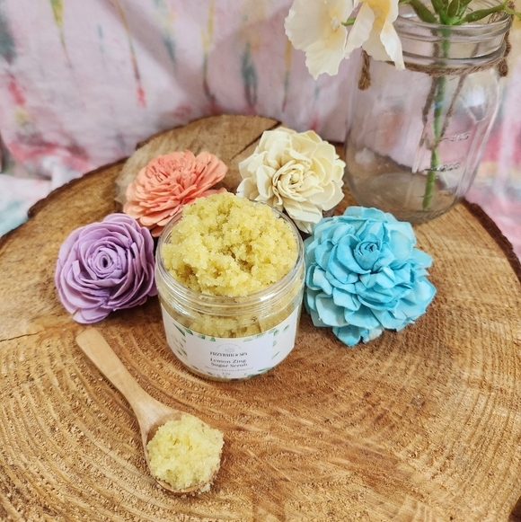 Handmade sugar scrub made by yours truly. Each container contains 6 or 8 oz of scrub and comes with its own wooden spoon.