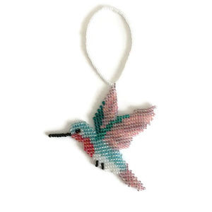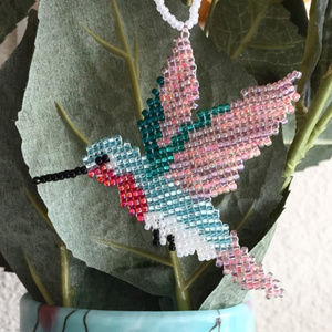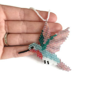A light blue hummingbird with a bright red throat, white tummy, emerald wings, and pink and purple feathers. This would make an adorable gift for any nature lover. Can be used as a Christmas ornament during the holidays, or as a sparkly sun-catcher year-round. Designed and handcrafted by me using glass seed beads and super strong beading thread. Reinforced with nontoxic glaze. I love custom orders. Please message me about your custom requests.