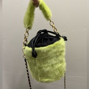 Handmade Lime Green Genuine Mink Fur & Drawstring Bucket Bag/Crossbody
