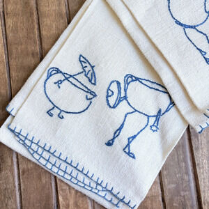 Add a touch of whimsy and artisan charm to your kitchen with this set of 2 embroidered linen tea towels featuring blue teapot and teacup characters!