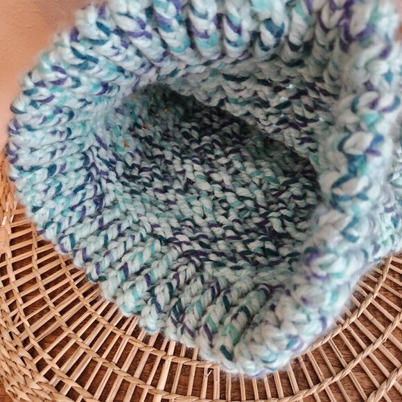 Handmade Loom Knit Winter/Fall Beanie Hat Multiple shades of blue and mint green Yarn is stretchy and loose fitting This hat measures about 22 inches in diameter and 11 inches tall Made in a smoke free and cat friendly home I recommend washing on gentle and laying flat to dry All my knit items are made handmade by me. I thoroughly enjoy loom knitting and making new creations for you!! Check out my other hats and scarves.
