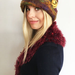 This creation is a substantial triangular shaped scarf hand knit with vintage luxury yarns from specialty knit shops, that have been out of production worldwide for years. The rare burgundy wine novelty yarn has 1 3/4 inch long eyelashes and is blended throughout with confetti-like red, black and green fibers which adds unexpected accents. This reversible, decorative piece can be worn indoors or out. Pair it over formal evening attire or add major impact over a denim jacket. Mona’s Collection jewelry and knitwear are sold at art shows. 🌾🐞Place your selection(s) in a bundle and include a listing of the gift wrapped with a ribbon in order to receive a private offer. 🍃Fiber Content: Premium Acrylic. (K10-12H)