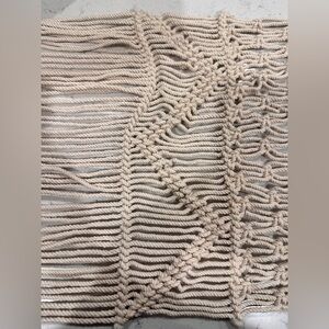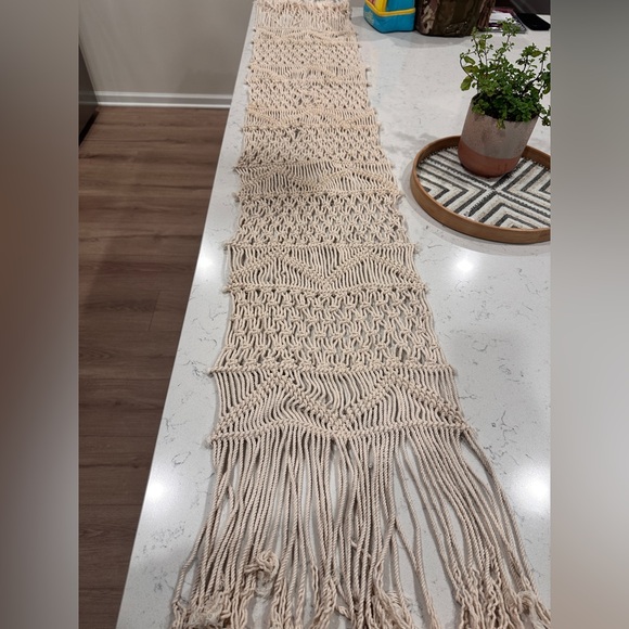 Beautiful handmade macrame table runner. Features intricate patterns and fringe detailing. Perfect for adding a boho touch to your decor.