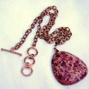 Handmade by me with love! This stunning necklace is made with a gorgeous large pink sea sediment gemstone jasper tear drop pendant as it's focal point. The whole stone is mottled with magenta and beige colors, and a touch of brown. It is hung by a solid copper bail and attached to a textured copper oval link chain. I finished it off with copper three ring toggle clasp, which allows it to be fully adjusted to just the right length. Total measurement of necklace is 18 1/4 inches long if fastened on the first toggle, 19 1/2 on the last.
