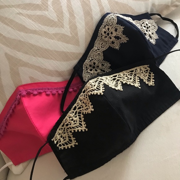 Handmade Masks. Fabric with hand-sewn lace trim.