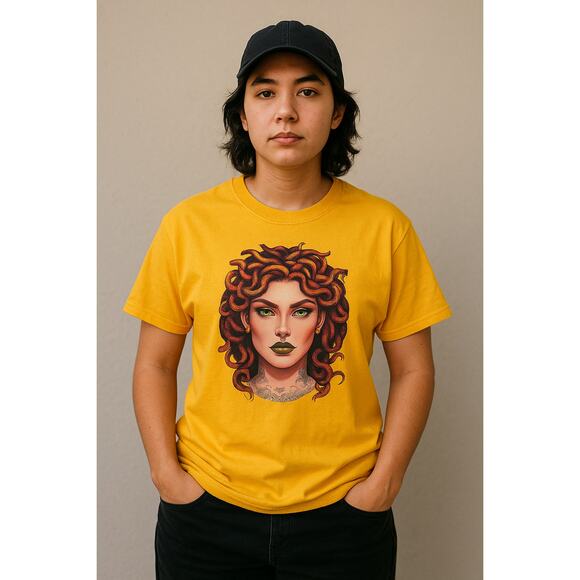 Stand out with this bold handmade Medusa graphic tee — featuring stunning digital artwork of a fierce Medusa with green eyes and snake hair. Crafted on a vibrant mustard yellow cotton tee, this statement piece brings streetwear edge with a mythological twist. Perfect for casual outfits, concerts, or anyone who loves bold, artistic fashion. Gently pre-loved and ready for your next look.