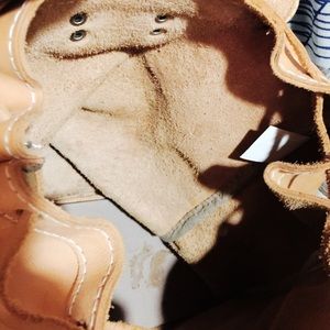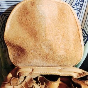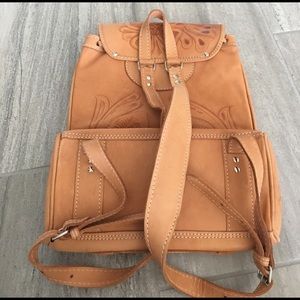 Genuine leather backpack. It’s pretty big... like a regular backpack for school. Inside is not lined. Beautiful Mexican pattern with buckles. Inside of backpack has a stain (photographed.) Price firm.