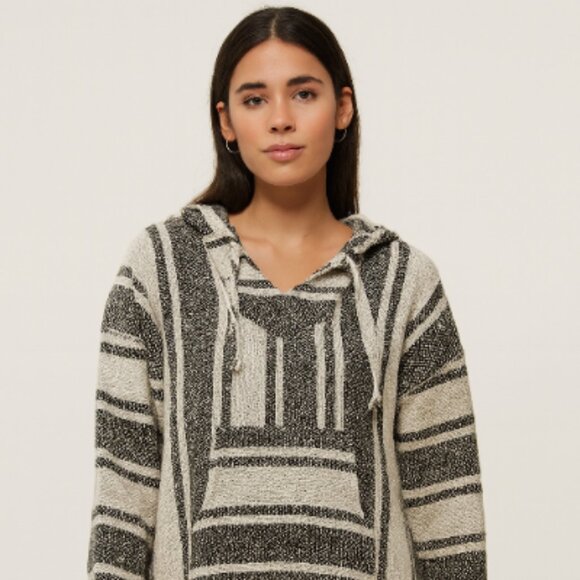 This classic handmade Baja hoodie (also known as a Mexican drug rug or surf poncho) features a timeless black and white striped pattern in a soft woven texture. Ethically Hecho en México (Made in Mexico), it’s a relaxed, cozy piece perfect for layering year-round.