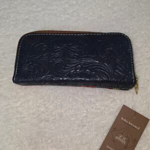 Handmade Mexican Black Embossed Leather Wallet with Floral Embroidery