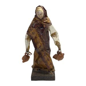 This unique set of vintage handmade Mexican folk art paper mache figurines beautifully captures the essence of traditional village life. The detailed craftsmanship and rustic charm of these old village people figurines make them a delightful addition to any collection of cultural or artisan pieces. Each figure showcases distinct characteristics, from the attire to their activities, embodying a nostalgic representation of rural Mexico.