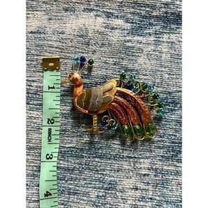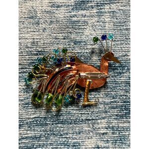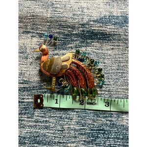 Really pretty handmade peacock brooch. Different color metals and beads. Approx 2.5" tall and just under 3" long