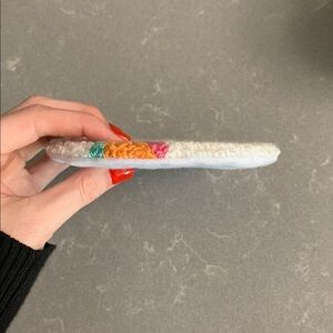 Large mug rug with vibrant colors. Features pink, orange, and teal waves on a white background. Big enough for huge coffee mugs!