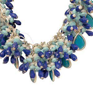 This necklace combines vibrant blue and teal glass drops with intricate beadwork, creating an eye-catching accessory. Its adjustable silver chain ensures a comfortable fit.