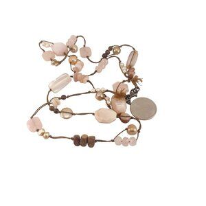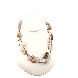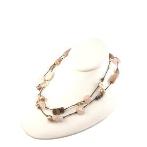 This exquisite handmade necklace blends the soothing hues of rose quartz, the classic elegance of pearls, and the earthy tones of wooden beads. Ideal for adding a touch of refined bohemian charm to any outfit, it features an intricate arrangement of beads strung on a durable thread.