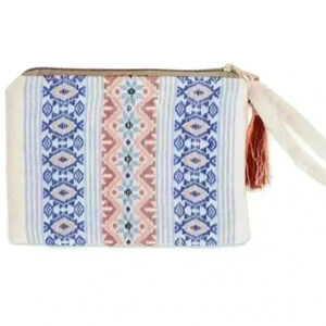 Working on a backstrap loom, Mirian Otzin in Guatemala creates this pretty cotton cosmetic bag. The handwoven case features elaborate patterns in cornflower, rose and yellow on an ivory background. The bag features a plastic lining for easy cleaning and a zipper closure with a cute tassel.