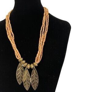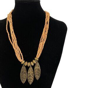 This elegant multistrand necklace features natural-toned beads paired with bronze leaf pendants and gold accents, delivering timeless style and versatility.