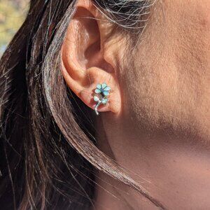 Enhance your jewelry collection with these stunning Native American Man-Made White Opal Flower Stud Earrings, beautifully handcrafted and unsigned by skilled artisan, Randolph Sanchez. Each earring features a delicate flower design, symbolizing beauty and nature, with shimmering man-made white opal inlays that reflect stunning flashes of color. Set in solid sterling silver, these earrings showcase traditional Native American craftsmanship and attention to detail.