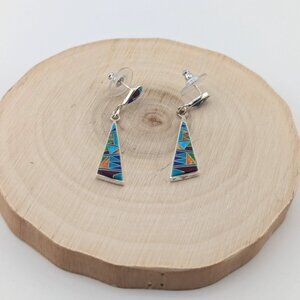 Adorn yourself with these striking sterling silver dangle earrings, featuring a vibrant and intricate multi-stone inlay design. Each earring showcases a captivating pattern of precisely cut and set natural gemstones, including what appears to be turquoise, lapis lazuli, spiny oyster, and other colorful stones. The geometric inlay work, particularly on the triangular dangle, is characteristic of Southwestern. Handcrafted and signed by Stanley Manygoats.