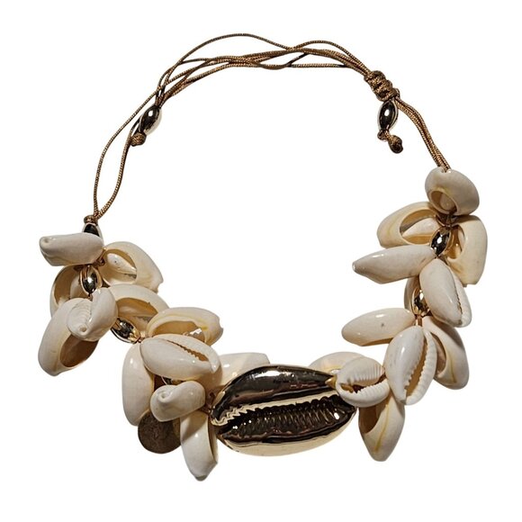 This bracelet features genuine cowrie shells and gold-tone accents, offering a lightweight, adjustable accessory with a natural beach aesthetic.