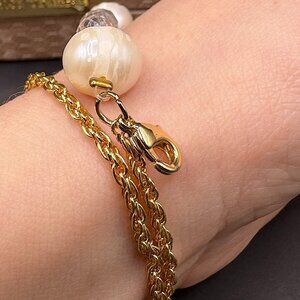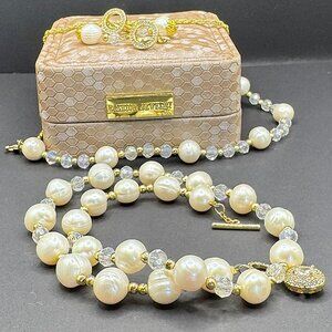 This handcrafted jewelry set includes a natural pearl bracelet, matching necklace, and coordinating earrings.