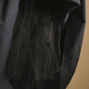 The fabric is 100% cotton. The dress has black tulle lining to give top skirt more volume and to hold the shape.