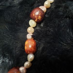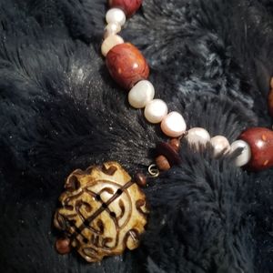 Features pearls and reddish brown wood beads with flower details. Tribal inspired wood pendant.