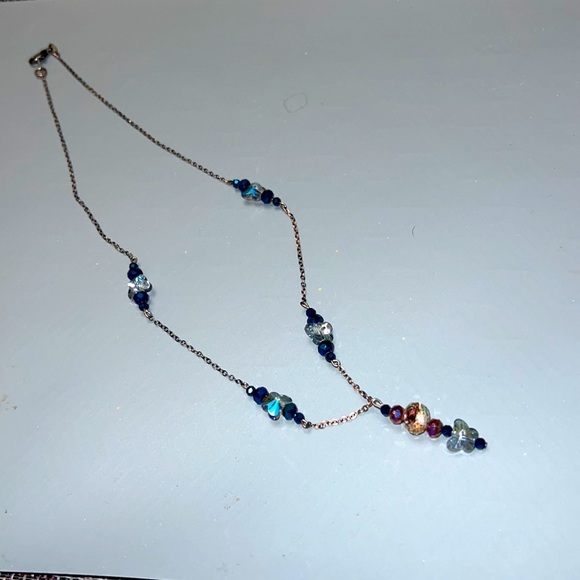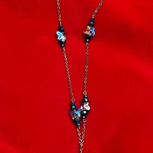 Blue Crystals beads - brownish brass finished chain 18~20 inches long. Accented with small butterfly