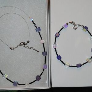 Handmade Necklace & Bracelet SET Glass Small Clear & Purple Iridescent Cubes w/ Glass Black Bugle Spacer Beads