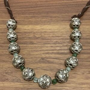 Handmade Necklace with Silver Plated Filagree & Jadeite Beads on Ribbon
