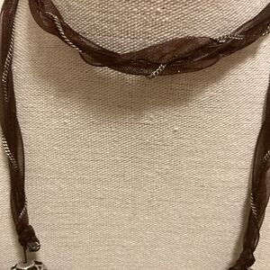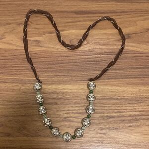 Handmade Artisan Ethnic Necklace with Silver plated filagree beads & jadeite spacers strung on brown Kantha fabric intertwined with a silver chain.