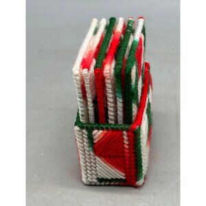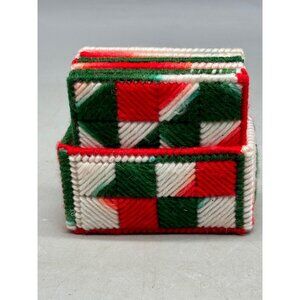 Enhance your holiday decor with this set of 6 handmade needlepoint Christmas coasters. Featuring a classic red and green design, these coasters come with a holder and show some signs of use.