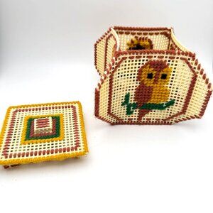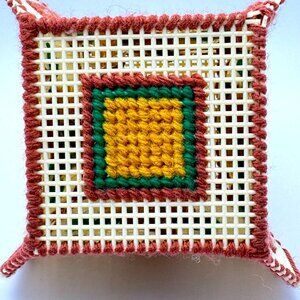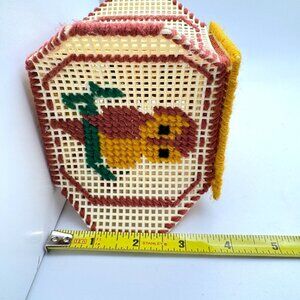 This vintage handmade needlepoint trinket box features a charming owl motif on durable plastic canvas. Ideal as a decorative piece or for storing small items.