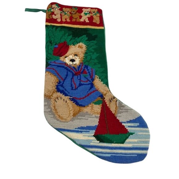 Handmade Needlepoint VTG Christmas Stocking Teddy Bear Sailor Girl