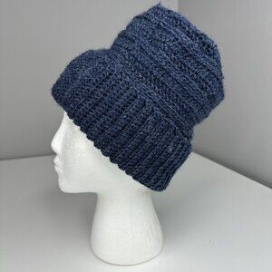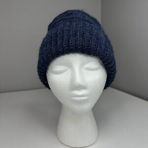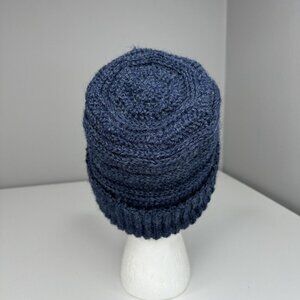 Hand-knit unisex warm and cozy beanie fits most Adult Large sizes, navy blue ribbed slouchy pattern, stretchy, easy care, soft, does cover ears and be worn rolled up or down. Care machine wash cold tumble dry low. Material 100% superwash merino wool. Condition is new never worn. Please preview the measurements to ensure fit. This was hand-knit in San Jose by an artist with a passion and talent for creating quality beanies, sweaters, scarfs and dog sweaters.