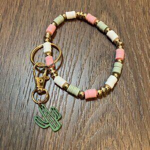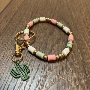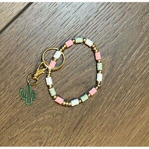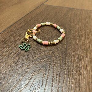 Handmade New Pink/Green/White/Gold Bead Wristlet Keychain with Cactus Charm