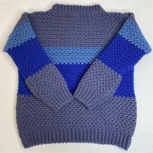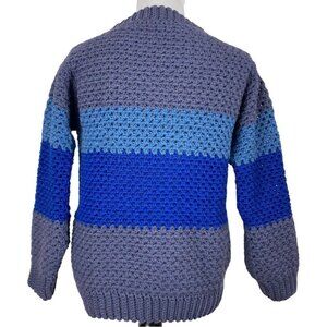 Handmade size large knit sweater, it is a beautiful unisex style, thick warm cozy, oversized, crew neck, 3/4 sleeves, thick tight-knit, stretch, color gray with blue striped with ribbed trim. Care machine wash cold line dry. Material acrylic yarn. This was handmade in San Jose California by an artist who has a passion and talent in creating quality beanies, sweaters, scarfs and dog sweaters. Condition is new never worn. Please preview the measurements to ensure fit. Size 6 dress form used in photos.