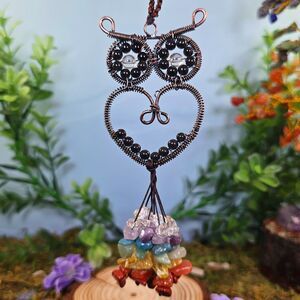 This piece measures 7" long and is hand-crafted with obsidian and clear quartz. From the bottom dangles chips of red jasper, orange aventurine, citrine, turquoise howlite, amethyst and clear quartz. It has a woven loop at the top, making it perfect to hang on your wall, in your car, or even to wear on a necklace cord!