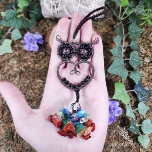 This piece measures 7" long and is hand-crafted with obsidian and clear quartz. From the bottom dangles chips of red jasper, orange aventurine, citrine, turquoise howlite, amethyst and clear quartz. It has a woven loop at the top, making it perfect to hang on your wall, in your car, or even to wear on a necklace cord!