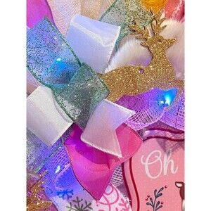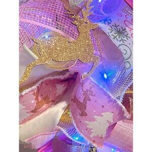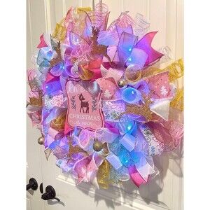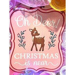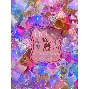 About 22 inches, 5 inch-deep door or mantle wreath. Pink, White and Gold mesh back. December/ Christmas themed w/ vibrant multi color wired ribbons (9 styles). Embellished with a metal Oh Deer! Christmas is near sign and matching deer and ball ornaments.
