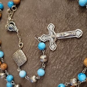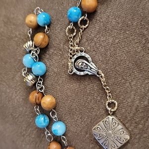 Handmade Olive Wood Vintage Metal Shell Beaded Crucifix Rosary Necklace