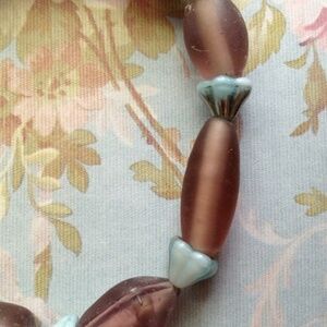 ombre pink glass beads. Little blue flower beads with one side dipped in silver. Stretch band.