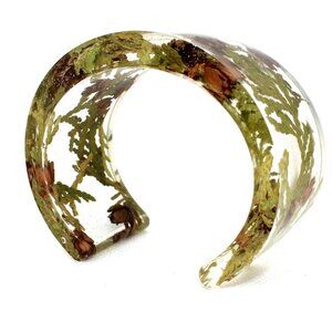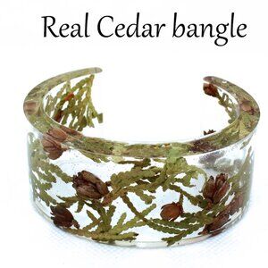 This is a resin bangle that I have made using natural cedar leaves and cones that I have collected them from my trees here in rural Ontario, Canada.